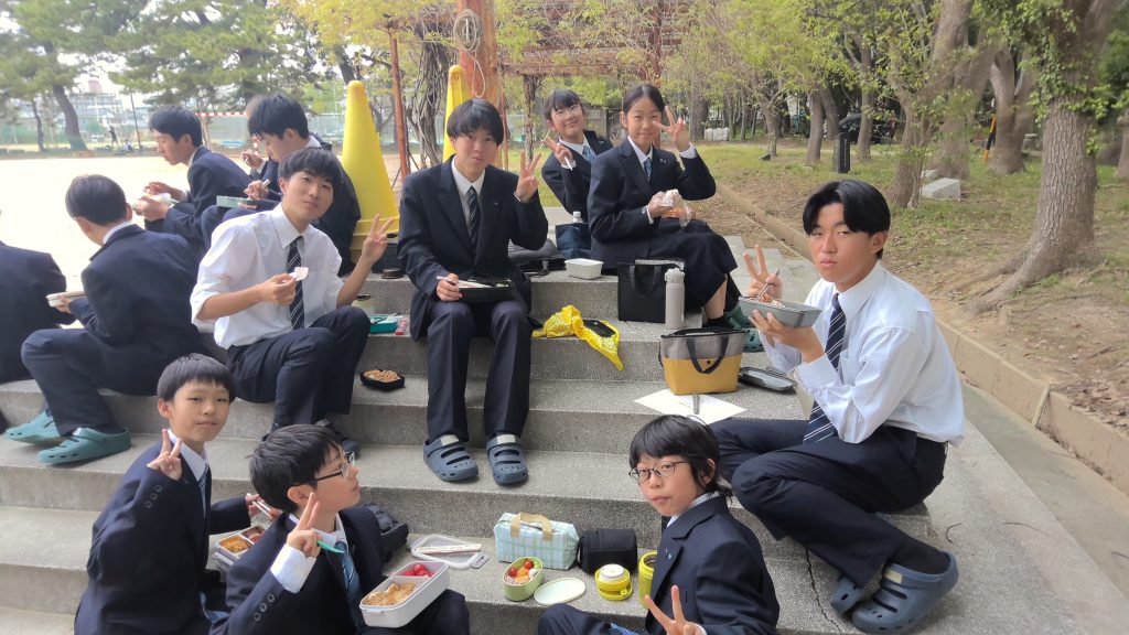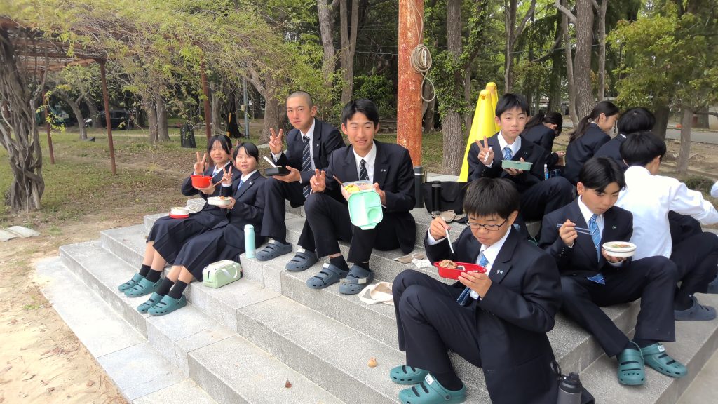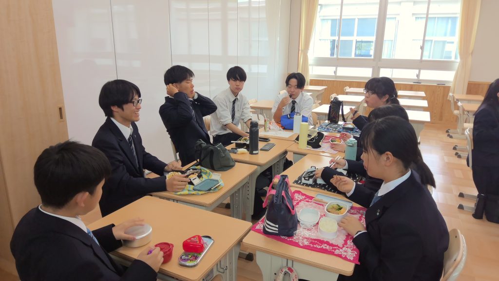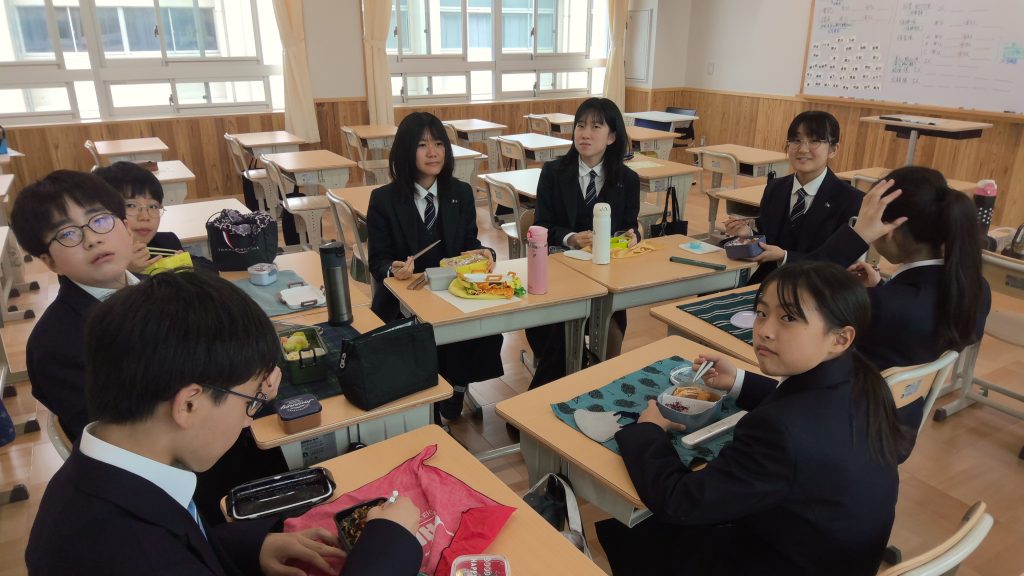 「時習館のこと、教えてください!」という中学校1年生の依頼を受けて、昼休みに高校3年生が来てくれて、一緒にお弁当を食べました。さすがは高校生。積極的に場を盛り上げ、会話を弾ませてくれました。どのグループも穏やかな雰囲気で、みんなの笑顔が印象的でした。高校生、ありがとう!