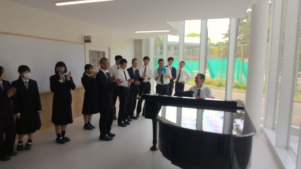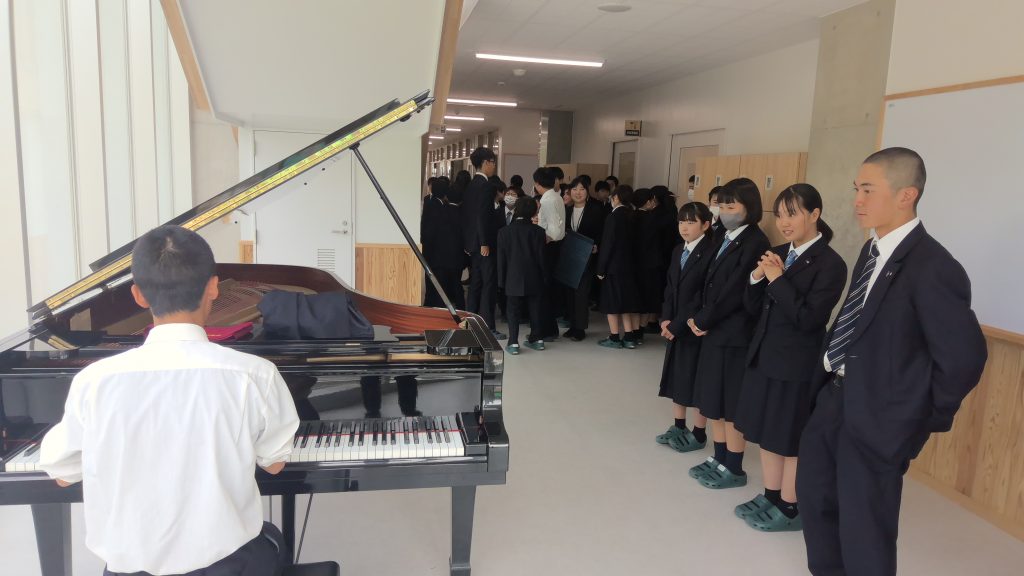 お弁当の時間の終了間際、中学生が教室で「ごちそうさま」を待っていると、1階から素敵なピアノの音色が・・・。
